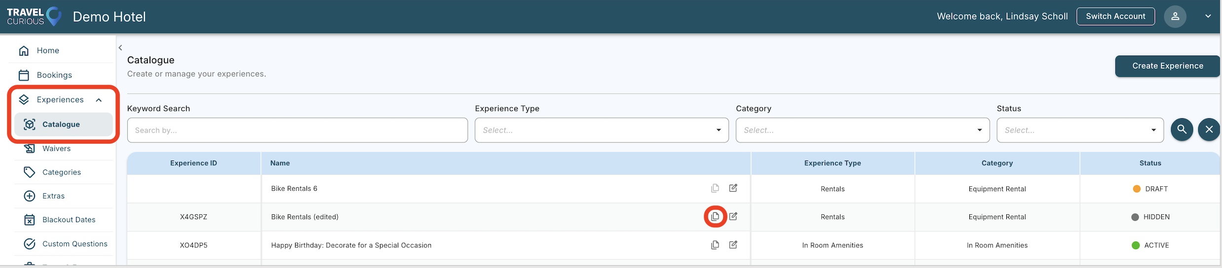To create a new experience, please follow these steps: Log in to https://activate.travelcurious.com Click on Experiences to open up the sub-modules Click on Catalogue and then on the "Create Experience" button on the top right-hand corner. This ...