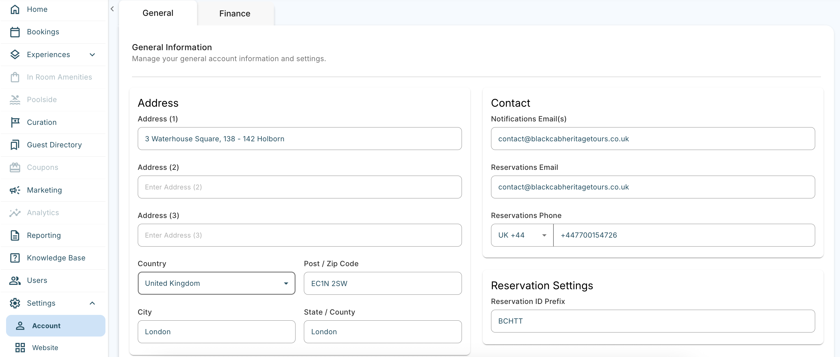 - General: Provide the full property address which will be shown on your upgraded page, email addresses and phone numbers for the Reservation Department and Notification Emails.