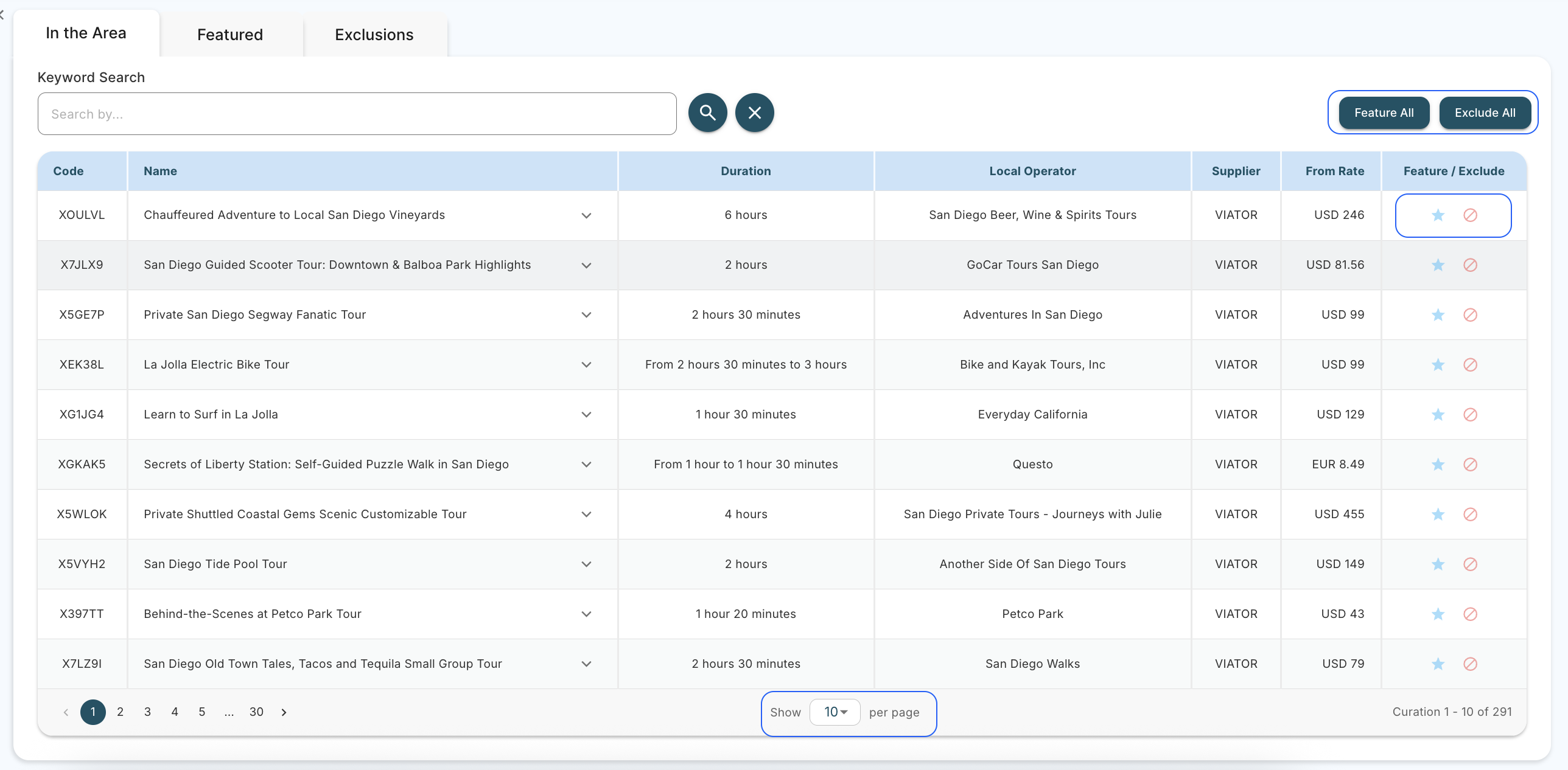 - To mass exclude, you can click on Exclude All, and this will exclude all the experiences you see on screen. To increase the number of results, change the number in the pagination at the bottom of your screen.